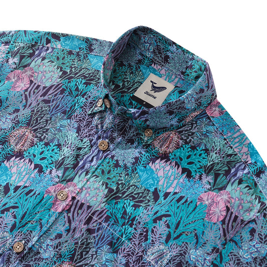 Men's Hawaiian Shirt Blue Coral Reef Print Cotton Button-down Short Sleeve Aloha Shirt