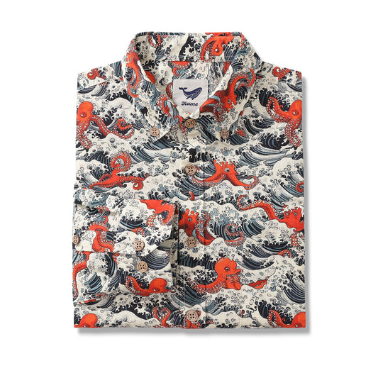 Long Sleeve Hawaiian Shirt For Men Octopus Carnival Cotton Button-down Aloha Shirt
