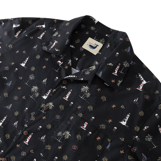 Hawaiian Shirt For Men Lighthouse Black Shirt Workwear Camp Collar 100% Cotton