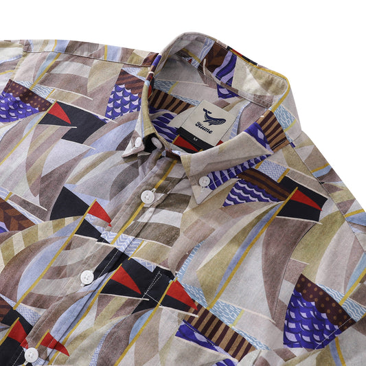 1960s Vintage Men's Hawaiian Shirt Sailboat Print Cotton Button-down Short Sleeve Aloha Shirt