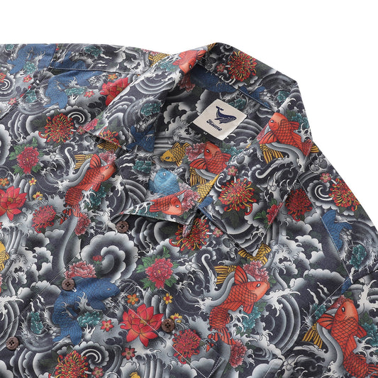 Wrinkle-Free Men's Hawaiian Shirt Japanese Koi Fish Print By Gee Button-down Short Sleeve Aloha Shirt