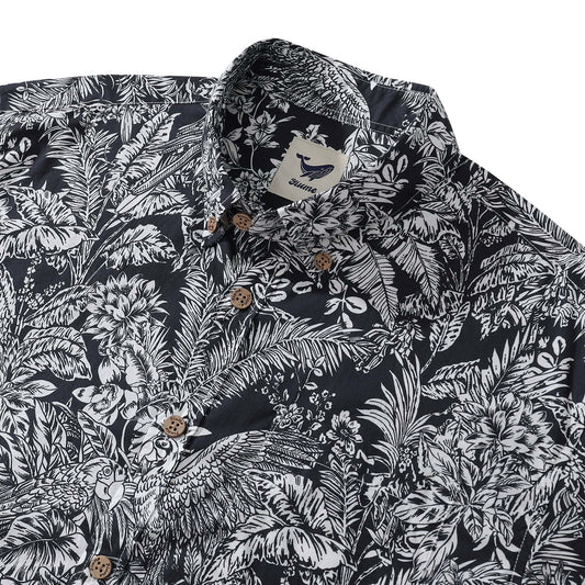 Men's Hawaiian Shirt Black Parrot In The Jungle 100% Cotton Button Down