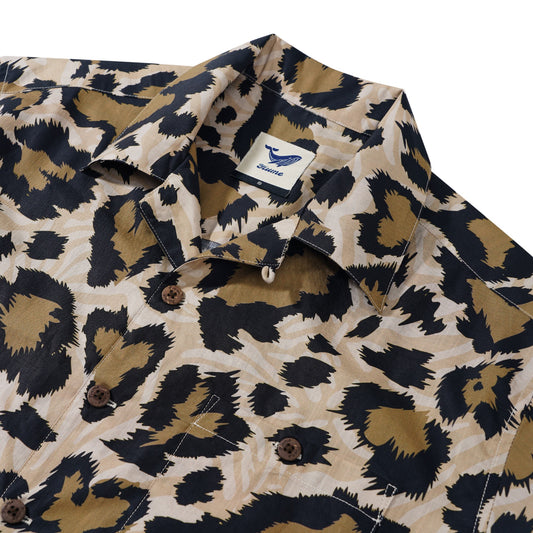 Men's Hawaiian Shirt Short Sleeve Camp Collar 100% Cotton Black Aloha Leopard Wilderness Whisper Leopard Print