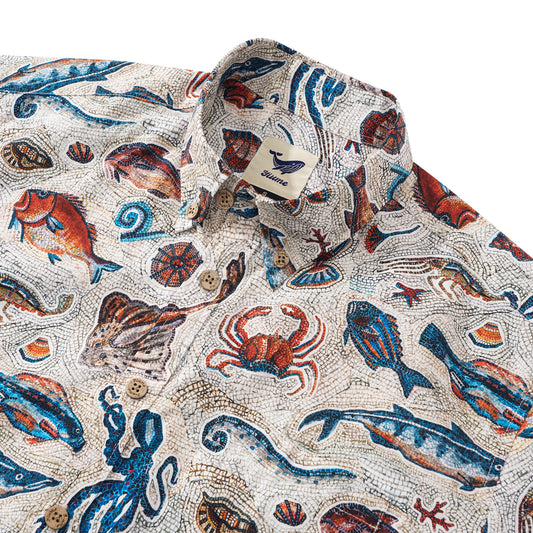 Men's Hawaiian Shirt Short Sleeve Button-down 100% Cotton Beige Aloha Seaside Mosaic