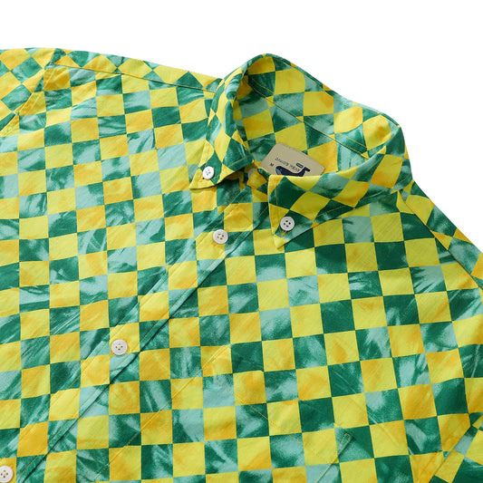 1970s Vintage Yellow-Green Rhombus Tropical Print 100% Cotton Men's Button-Down Shirt