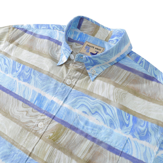 Men's Horizontal Stripe Shirt Blue Waves Print Casual Short Sleeve Button Down