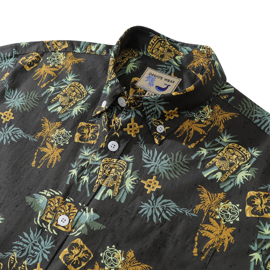 Hawaiian Shirt For Men Tiki Art Print Vintage Black Cotton Aloha Button Down