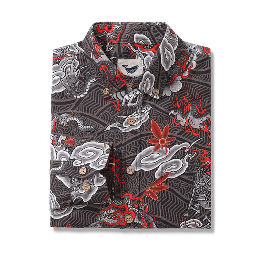 Long Sleeve Hawaiian Shirt For Men The Dragon's Flight Cotton Button-down Aloha Shirt