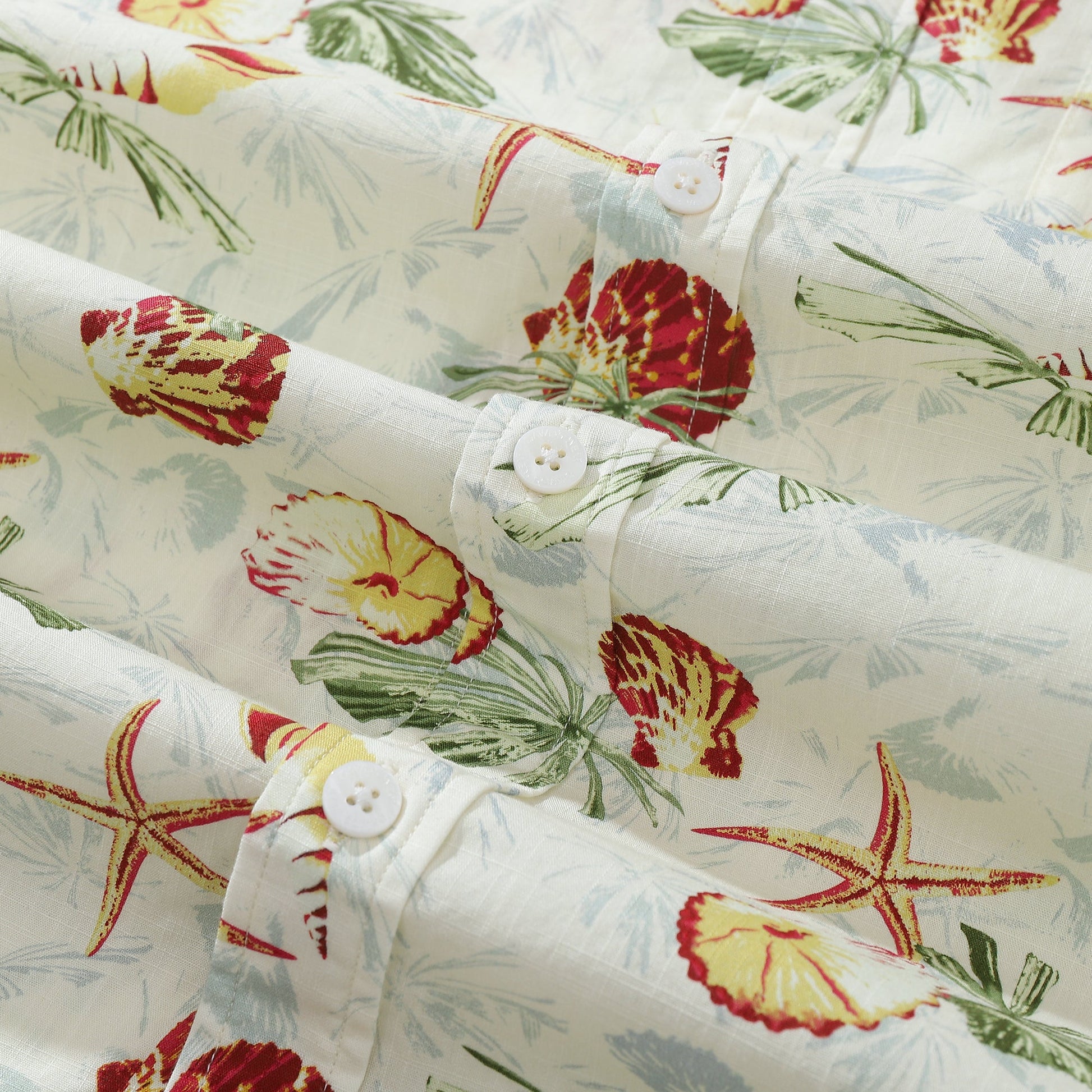 This shirt features a light-colored base with palm tree silhouettes and scattered simplistic designs of shells, starfish, and green palm leaves, creating a comfortable and relaxing vibe. Crafted from high-quality materials, the shirt is both soft and durable. It is not only fashionable but also practical, pairing well with various pants, making it a great choice for both vacation and daily wear.