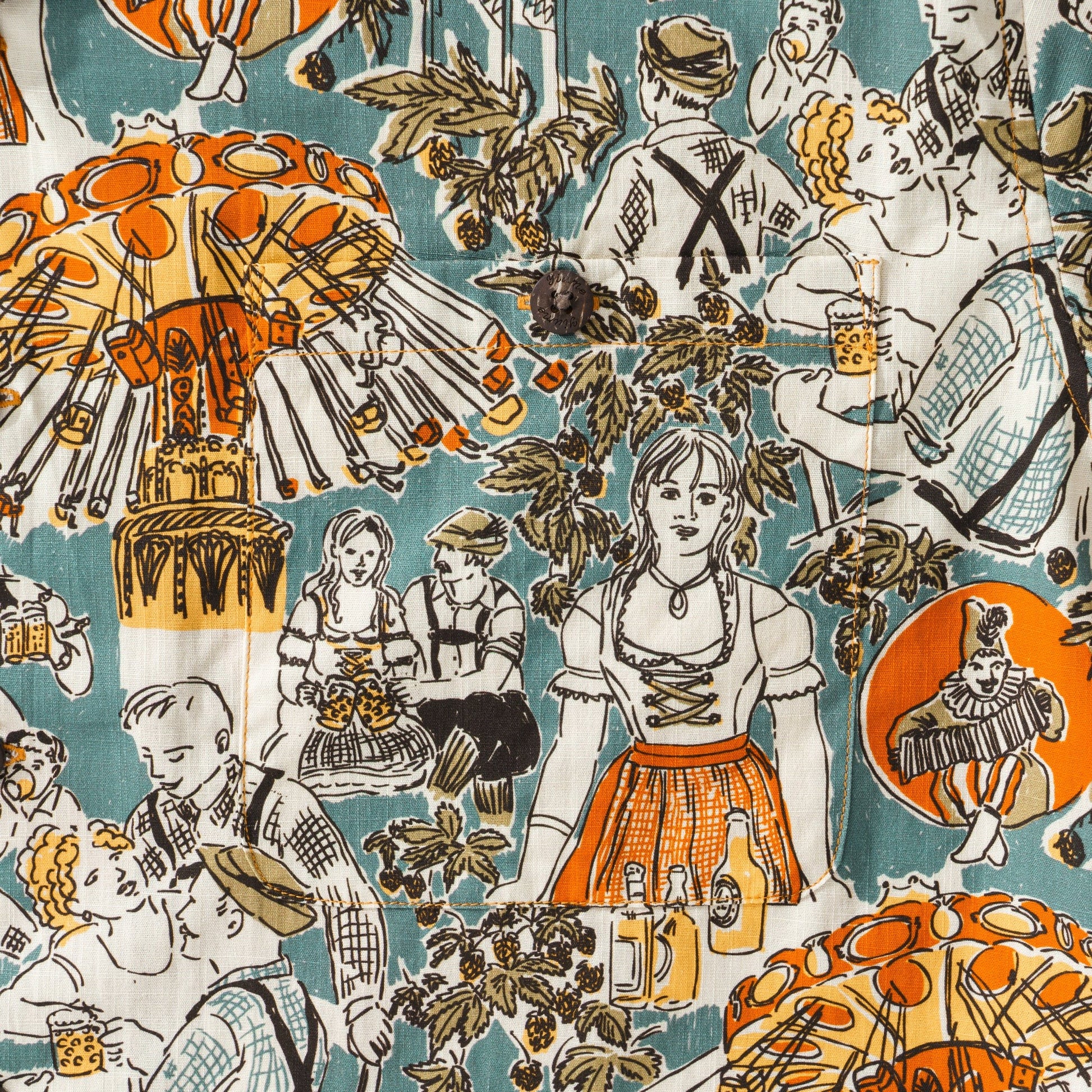 This illustrated "Oktoberfest" shirt celebrates the traditional Bavarian folk festival. This charming retro design encapsulates the friendly atmosphere of Germany's most famous beer folk festival, brimming with nostalgia and timeless appeal. In a rich and warm decor, iconic German elements such as characters dressed in folk costumes, beer mugs and hops mingle with the fantasy of a carousel, paying homage to the world's largest beer fair and festival. So now enjoy the party!