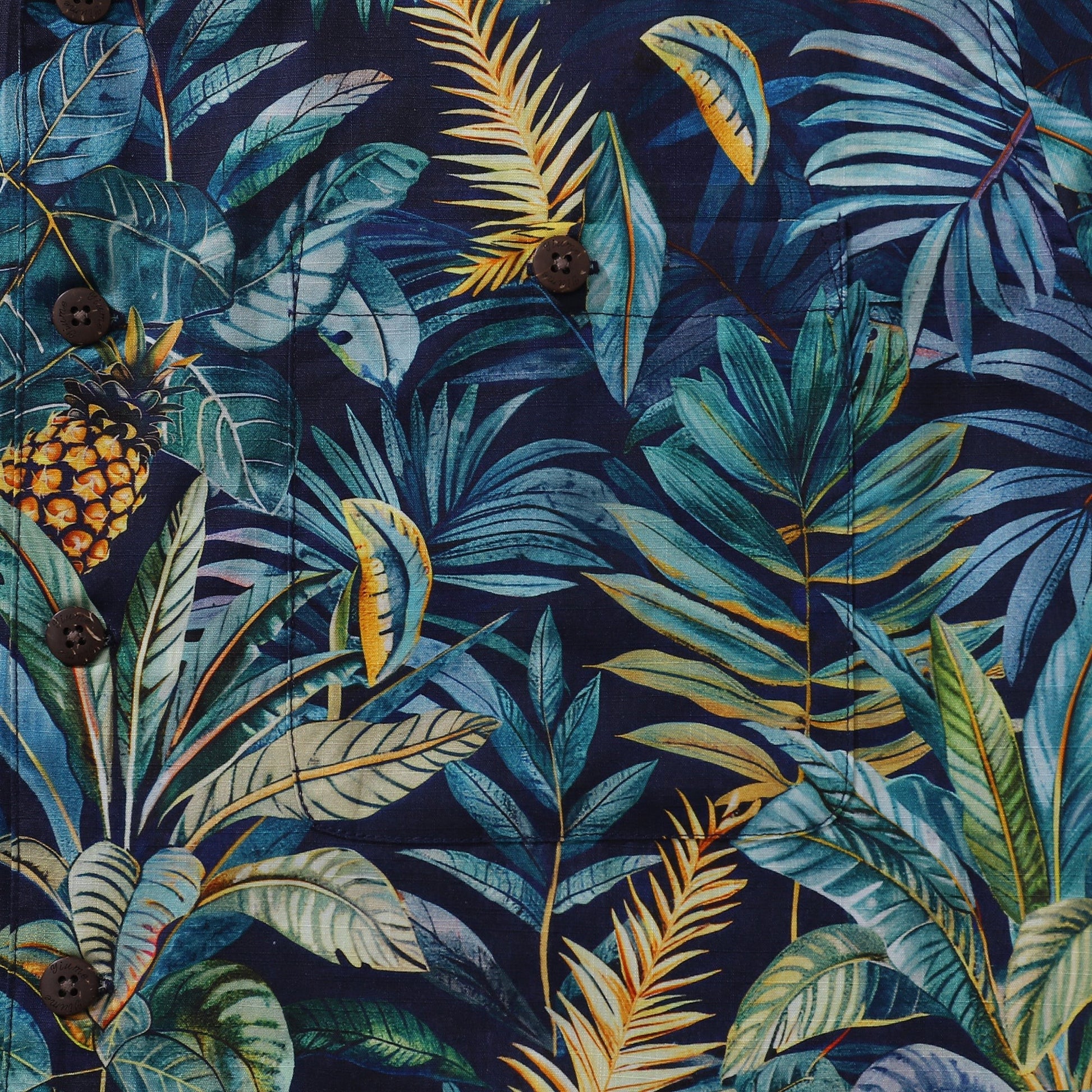 In a lush tropical jungle, pineapples and leaves grow densely against a deep blue background, with a delicate watercolor texture, blue and green blend together, accented by vibrant yellow, making this pattern both visually impactful and very harmonious.