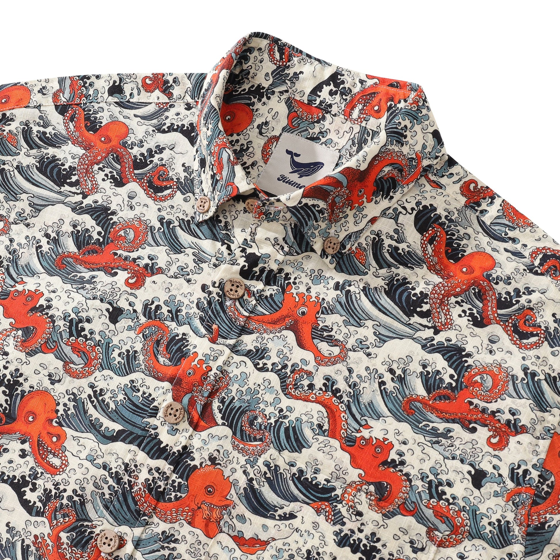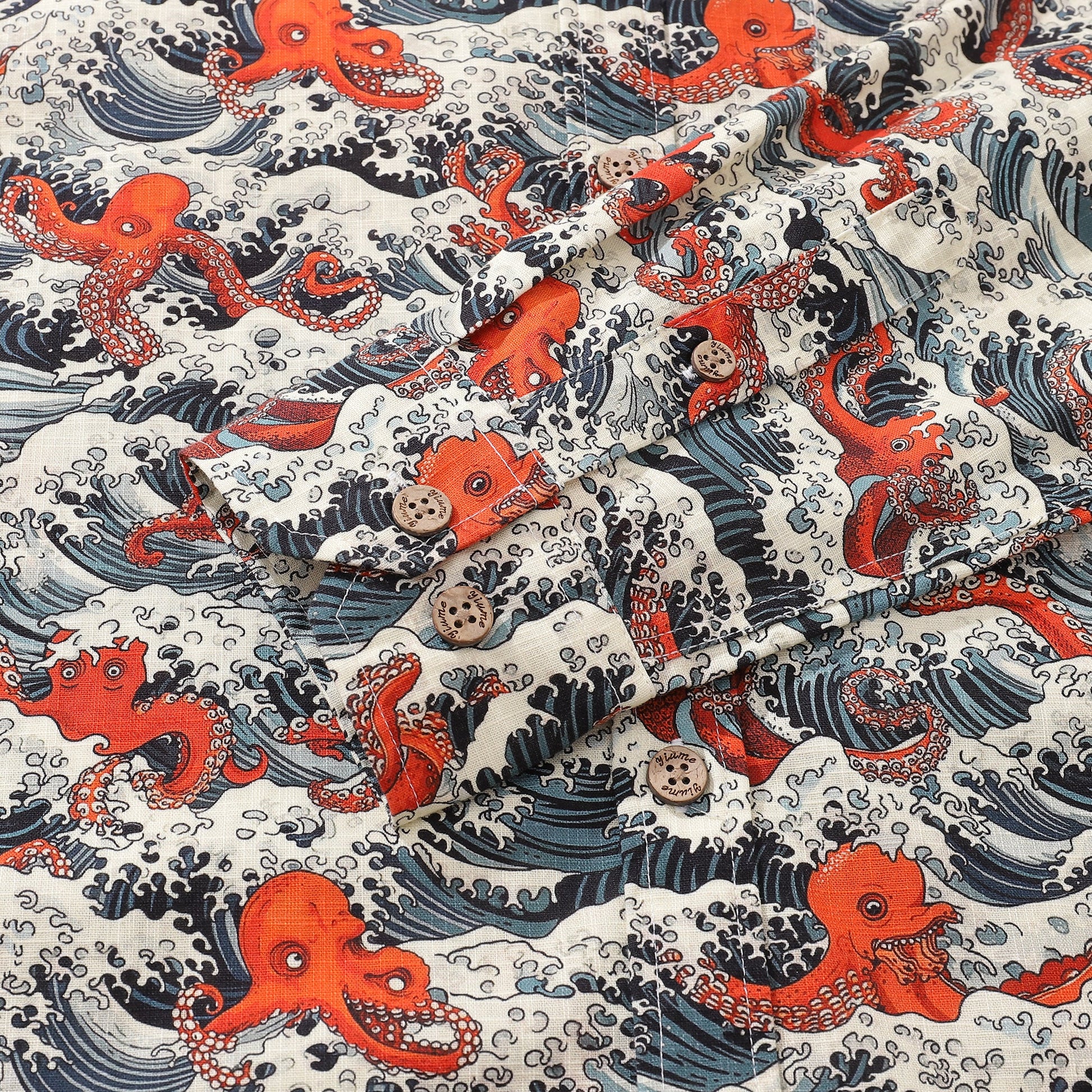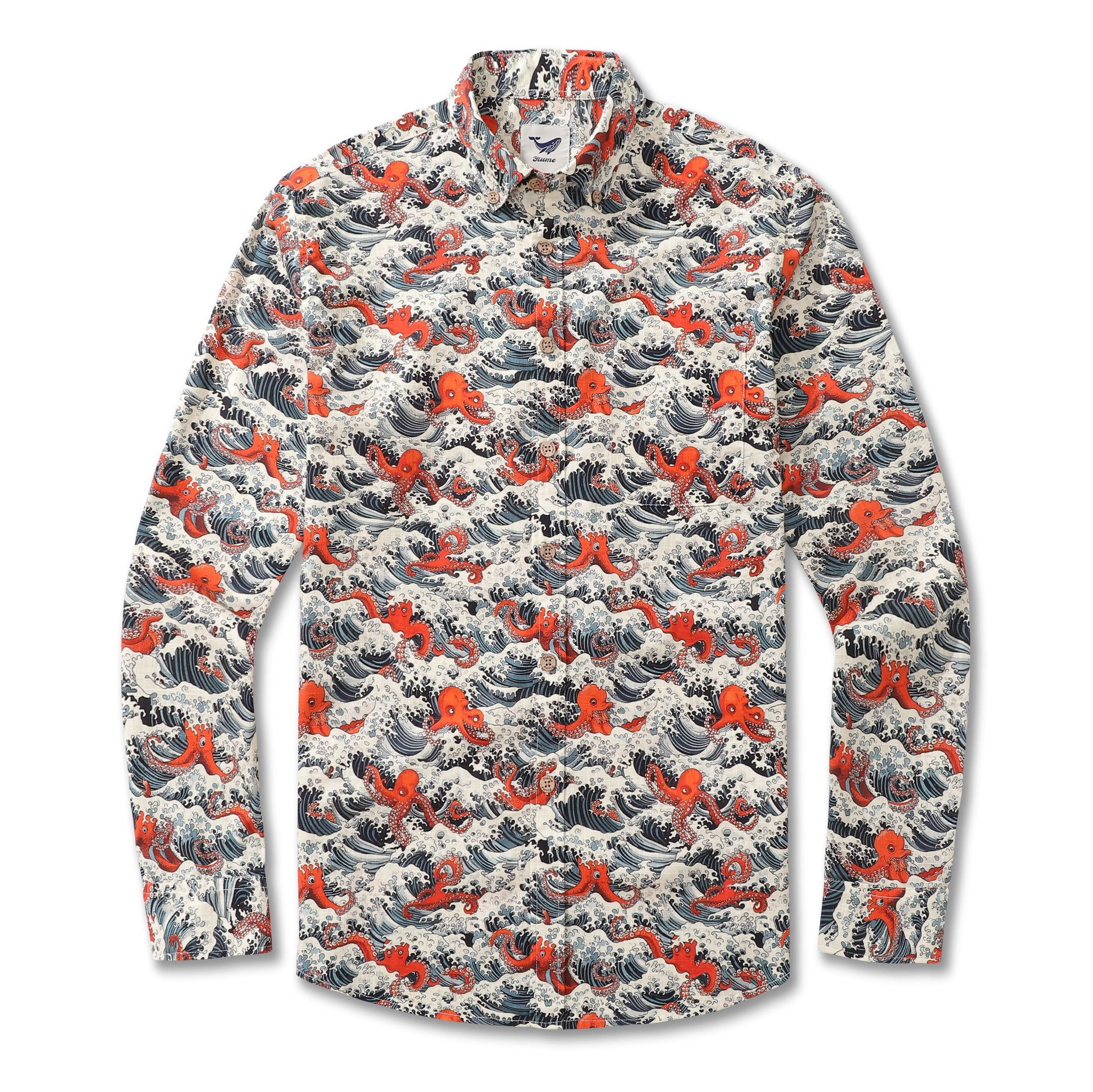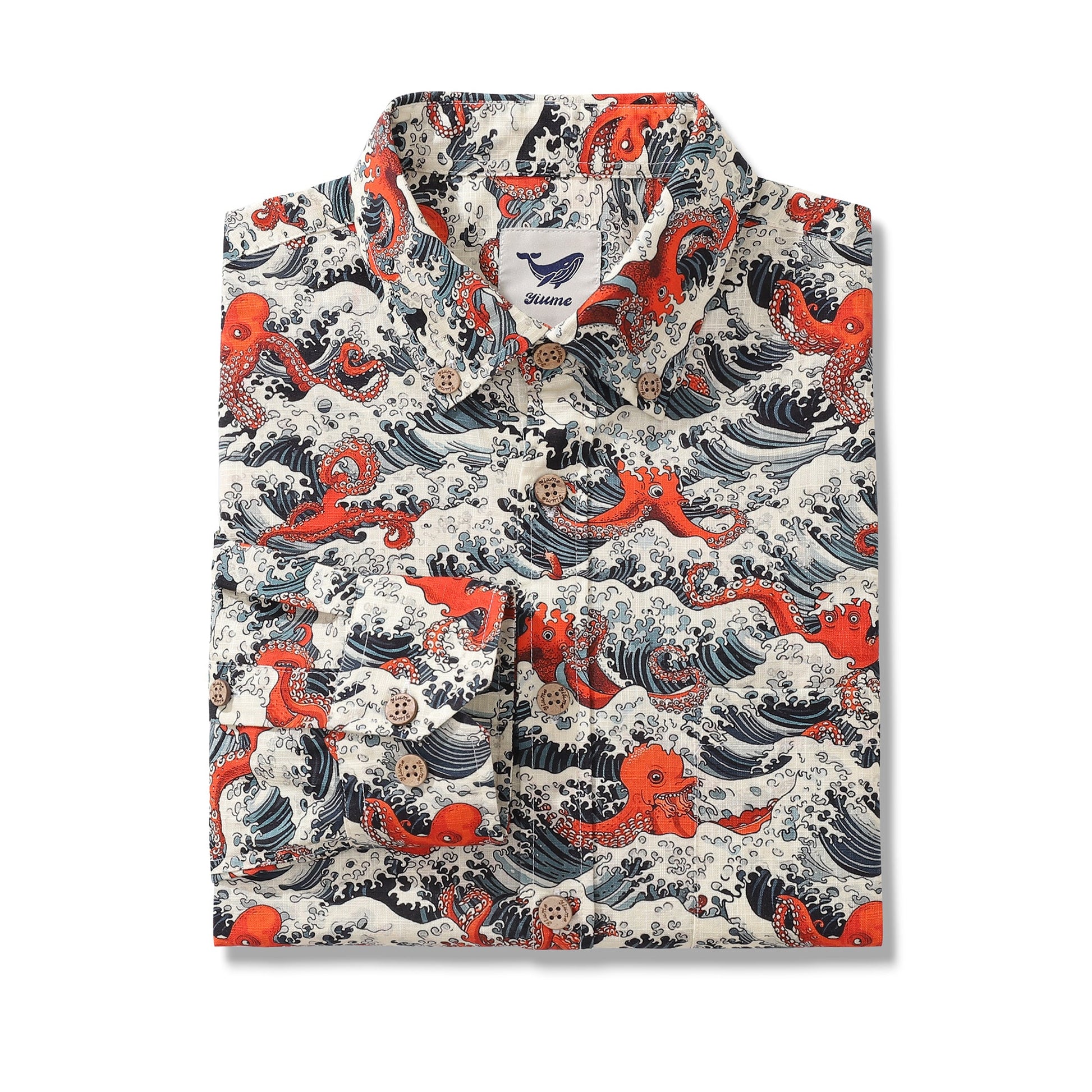 Yiume Outlets Long Sleeve Hawaiian Shirt For Men Octopus Carnival Cotton Button-down Aloha Shirt